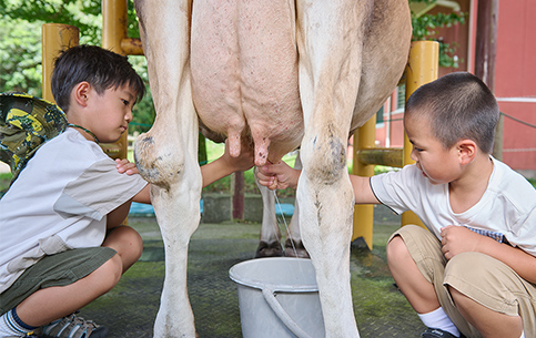 楽しみだった牛の乳しぼりにチャレンジしてみたよ!係の人のアドバイスをよく聞いて、そっとしぼってみたら…やった大成功!