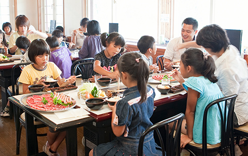 お昼ごはんはまきばのレストランでゆっくり。牛カルビの焼肉に、羊のお肉をドーム型の鉄板で焼くジンギスカン。特製カレーのおいしそうな匂いも漂ってきて…どれにしようかな?
