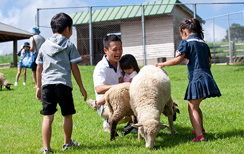 ふれあいコーナーで元気いっぱいな動物たちにごあいさつ♪のんびり草を食べる、モコモコ羊たちと触れ合ったよ!餌やり体験もしたよ!